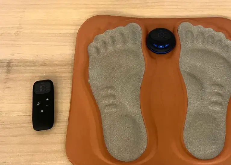 Qinux FisioFeet is a massage mat equipped with Electrical Muscle Stimulation (EMS) technology. It has the shape of an ergonomic insole placed on the floor where you rest your bare feet, activating the muscles, improving circulation, and relieving the feeling of tired, swollen, or cramping legs.